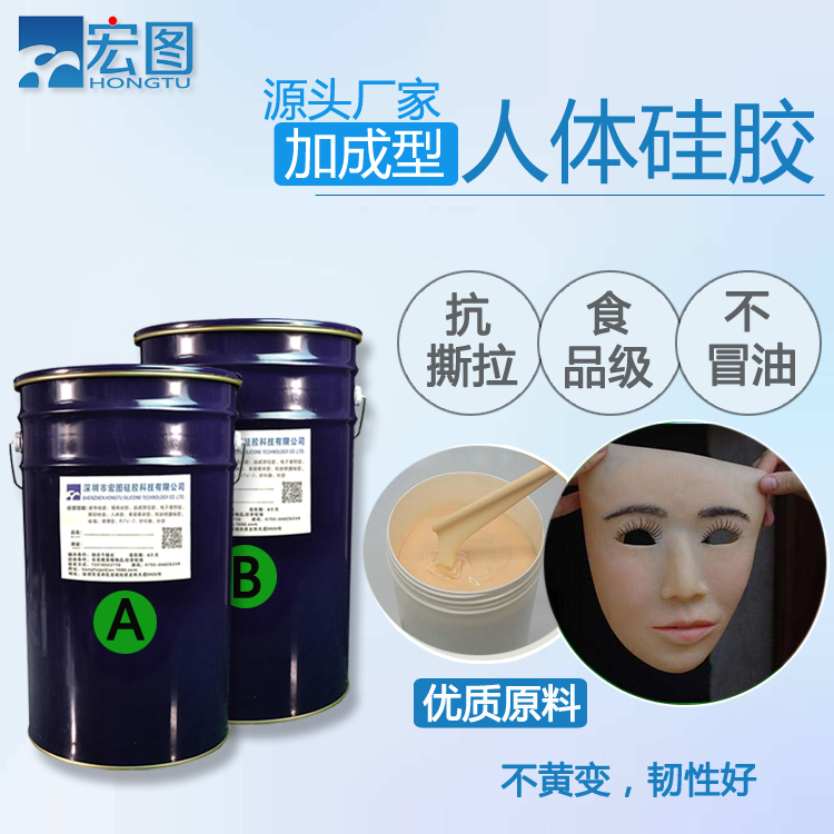 人體硅膠是一種加成型雙組份液體硅橡膠,無(wú)毒無(wú)味安全環(huán)保,硫化后會(huì)成為柔軟的彈性材料。 人體硅膠分AB雙組份,A組分硅膠,B組分固化劑,A:B一般為1:1。該產(chǎn)品既能室溫固化,也可以加溫固化,顏色為無(wú)色或皮膚色,其它顏色需聯(lián)系我司進(jìn)行特調(diào)。